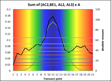 Maßzahl Transsekt und Verteilung der 8 Klassen, Maßzahlen werden auf der rechten y-Achse dargestellt Aus Platzgründen werden nur die Extreme dargestellt