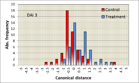 Die Verteilung der "Scores" (Punkte, Wert der Diskriminanzfunktion) auf die Klassifikationsklassen zeigt: nicht signifikant, der Stress ist nicht erkennbar, die Klassifikation ist mit 67% relativ hoch, kann sich aber um etwas anderes handeln als die Behandlung. Wir haben die Erfahrung gemacht, dass bei frühen Messungen im Verlauf der Versuchsaufbau oder juvenile Wachstumsprozesse möglicherweise das Ergebnis beeinflussen können und es zu einer Pseudoklassifikation kommt. |